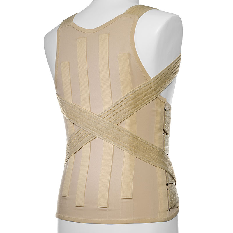 Tutore tronco per osteoporosi, cedimenti vertebrali, artrosi dorso-lombare, dorsolombalgia, traumi dorso lombari, ernia del disco dorso lombare. CARATTERISTICHE TECNICHE Altezze retro cm 50 e davanti cm 22, tessuto in cotone elasticizzato Gardenia, tiranti di rinforzo regolabili in tessuto Microgrip, bretelle in morbido tessuto Microgrip e steccatura due 2008 cm 42 paravertebrali estraibili affiancate da due 1505 cm 34 estraibili retro e quattro 1304 cm 26-24 al fianco, tutte ricoperte con strisce di gallone rigido, chiusura velcro. Colore nudo ➤ Particolarità • Leggero in tessuto di cotone elasticizzato. • Tiranti lombari regolabili che scorrono su fibbie per una perfetta regolazione. • Bretelle in morbido bendaggio.