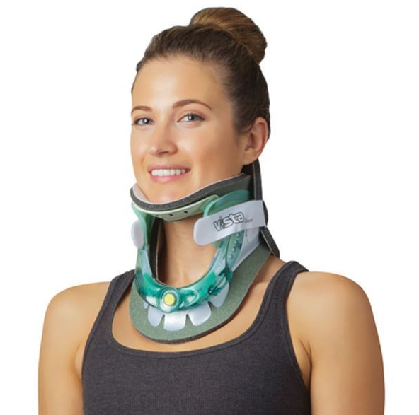 Collare cervicale bivalve regolabile in altezza. Prodotto marchiato CE. Il disegno di queste ortesi, grazie al pronunciato supporto mentoniero ed al flessibile supporto occipitale, permette l'immobilizzazione dei movimenti in flessione, estensione, rotazione assiale ed inclinazioni laterali del tratto cervicale.