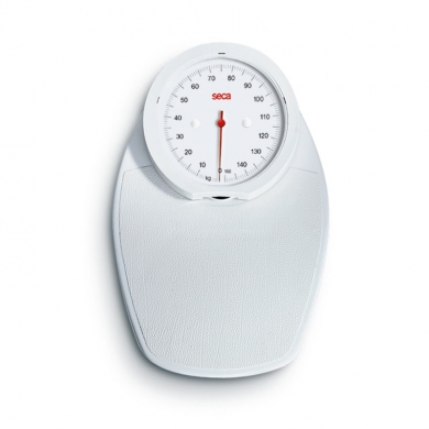 Bilancia meccanica da terra, compatta e solida. Il grande quadrante ad orologio, con cifre nere su sfondo bianco, permette una facile lettura del peso. Cassa in acciaio e piattaforma ricoperta da cuoio sintetico bianco o nero. Funzione regolazione dello zero. Portata massima utilizzatore 150 kg. Peso: 3,5 kg.