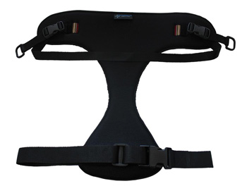 Cintura realizzata in vellutino accoppiato con area interna in retina traspirante, imbottita in poliuretano espanso e con tiranti di regolazione in nastro di poliestere, dotati di anelli.
