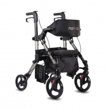 Costruito con una struttura pieghevole in alluminio leggero, combina la funzionalità di un tradizionale rollator alla comodità di una carrozzina spinta da un accompagnatore.