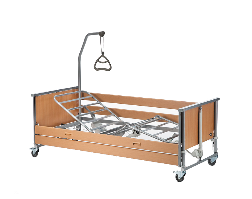 Il letto elettrico ortopedico Medly Ergo ha in dotazione standard le sponde in legno e il sistema alzamalati con triangolo, inoltre grazie al suo design semplice e pulito rende facile l'utilizzo dei sollevatori e dei tavolini attorno al letto, ed è pertanto adatto sia all'ambiente domestico che a quello delle Rsa.