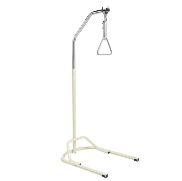 Alzamalati a piantana da terra costituito da una solida base in acciaio verniciato con tappi in Polietilene, un tubo di giunzione, un tubo superiore sagomato ed una maniglia a triangolo con cinghia regolabile. Struttura regolabile in altezza. Supporto utilizzato dai pazienti per afferrarsi e sollevarsi, o per cambiare posizione o per avere un aiuto per alzarsi dal letto. Destinato all’impiego in ambito ospedaliero, sanitario e domiciliare