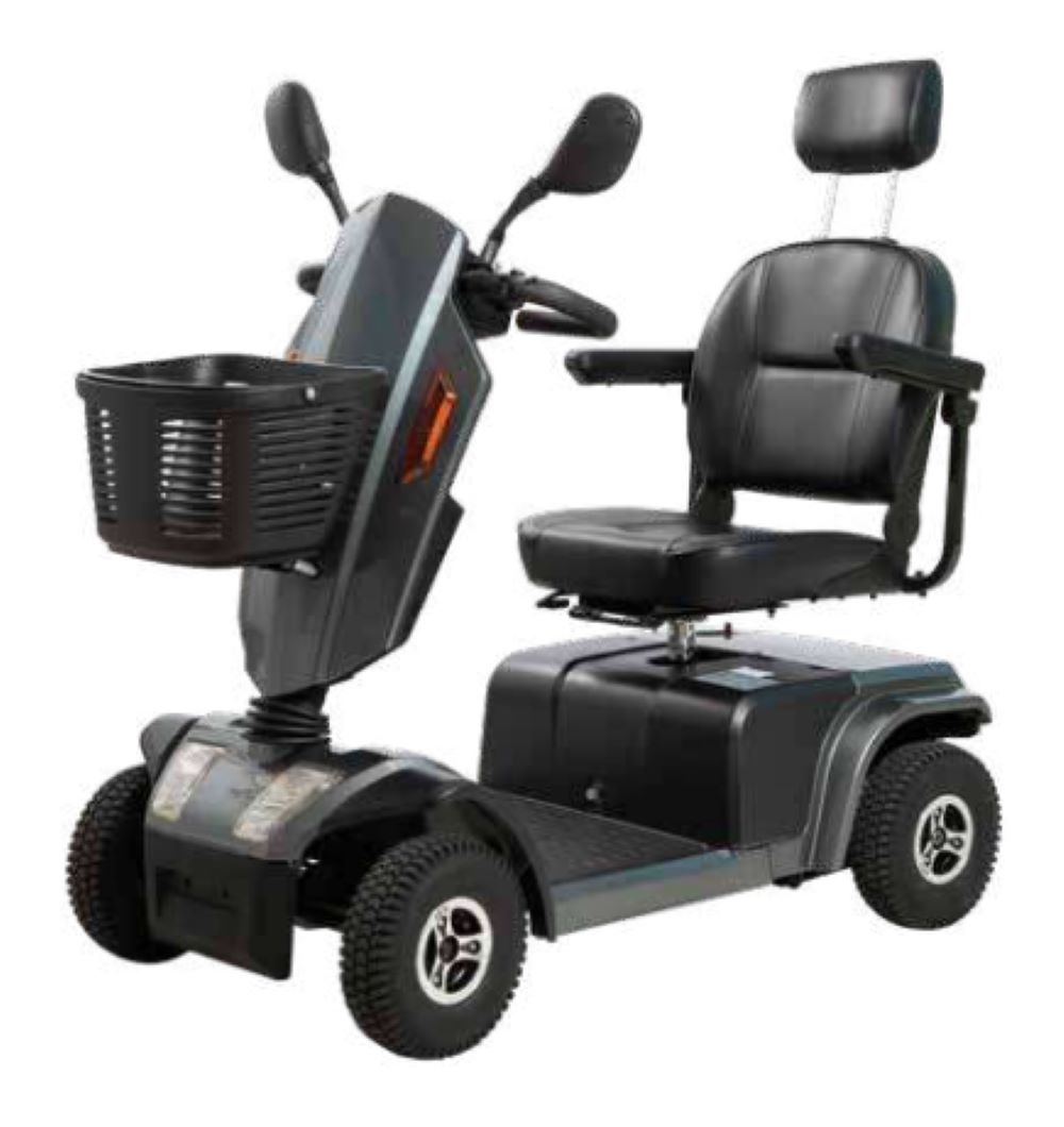 Scooter elettrico Gary, dotato di 4 ruote pneumatiche e ammortizzate, inclinazione dello sterzo, rotazione del sedile, poggiatesta, braccioli elevabili che si regolano in altezza e larghezza.