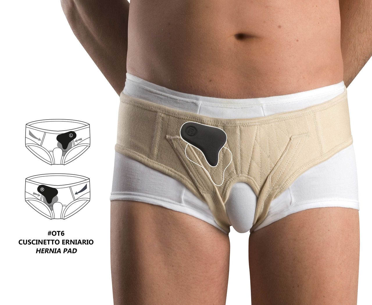 Cinto erniario basso, con cinghie sottocoscia regolabili con velcro, tessuto in cotone e possibilità di indossarlo a diretto contatto con la pelle.